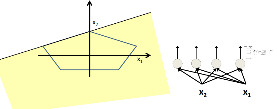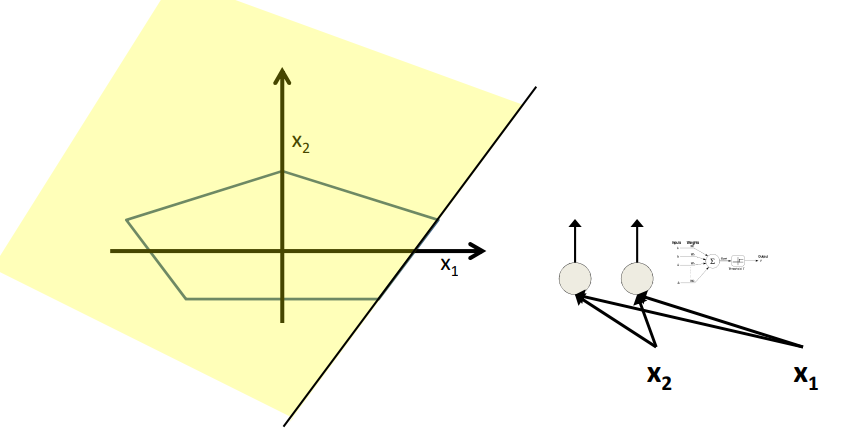 如图所示,每个感知机构成的线性边界组成了五边形的一个边。最后将这个五个边界再进行组合就可以构成五边形。
