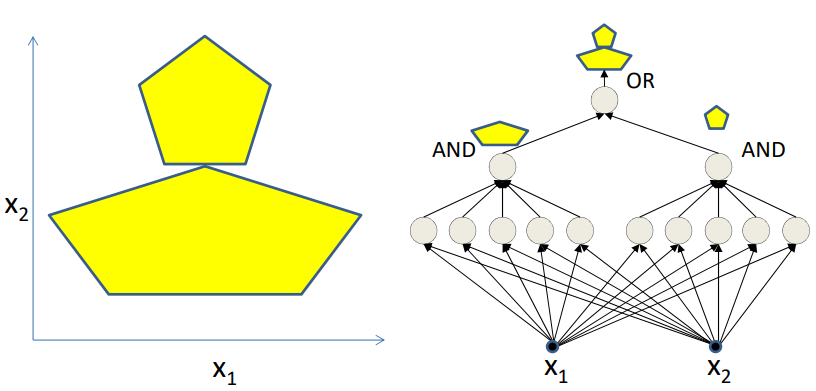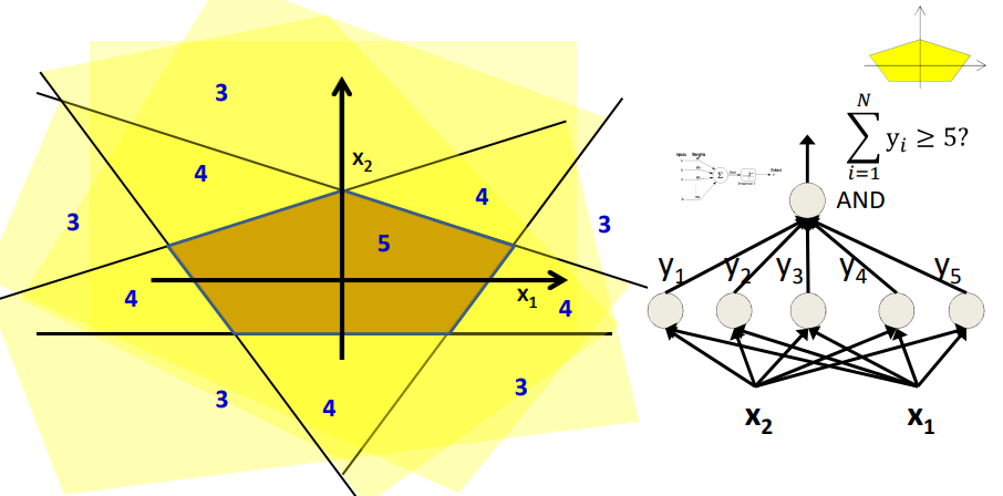 如图所示,每个感知机构成的线性边界组成了五边形的一个边。最后将这个五个边界再进行组合就可以构成五边形。