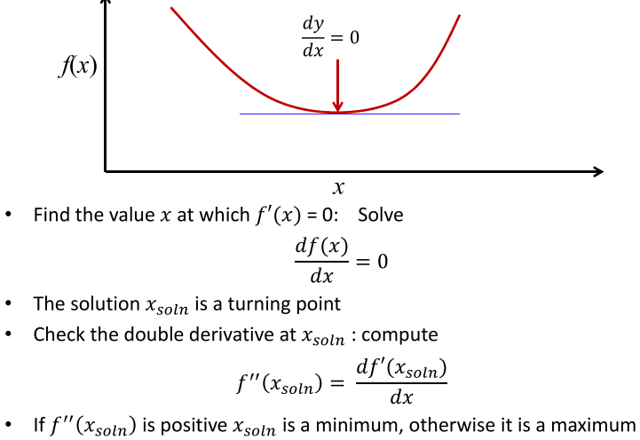 优化问题通常是寻找使函数$f(x)$取得最小值的$x$。高中的时候我们就学过求极值的问题,解题的思路一般分为两步:1)先通过一阶导数为0求得函数的转折点。2)然后计算转折点的二阶导数来判断是极小值点还是极大值点(有可能是转折点)。整个的计算过程如图所示: